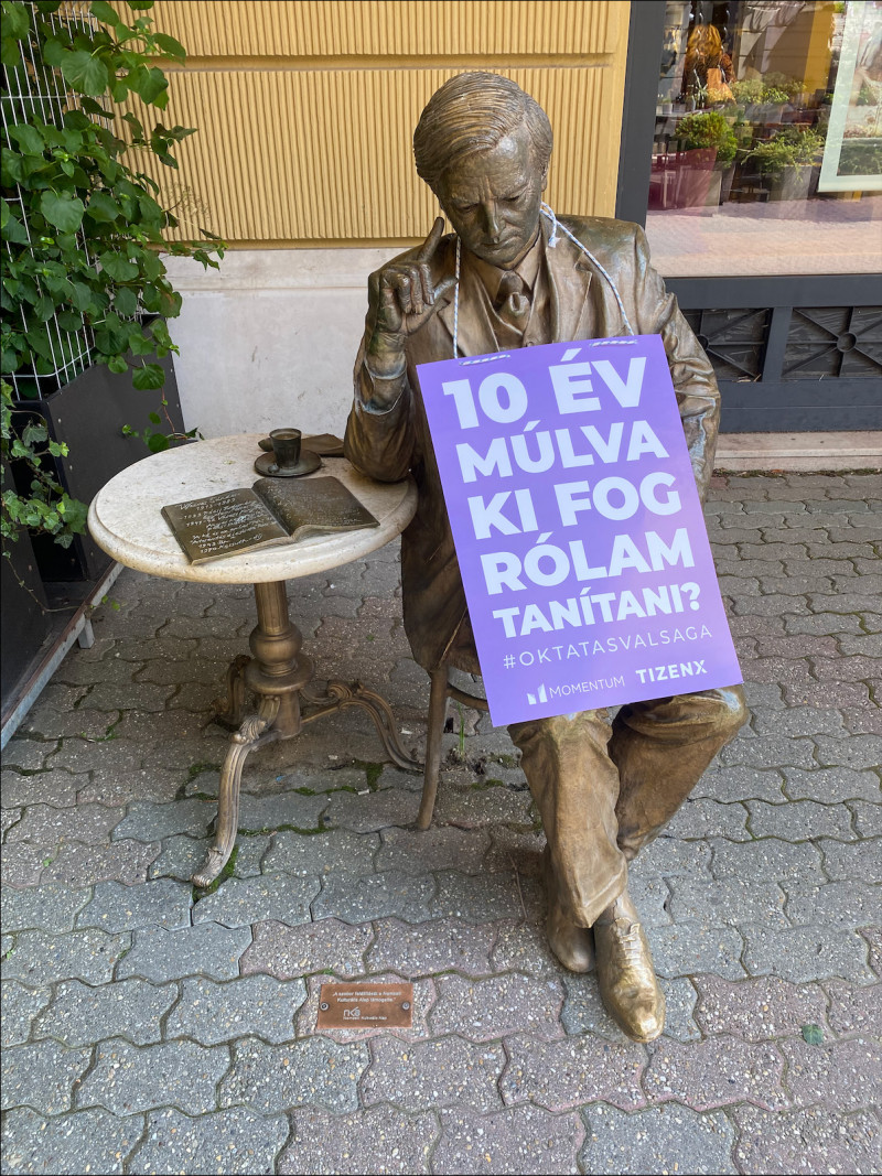 A táblákon a „10 év múlva ki fog rólam tanítani?” szöveg áll, utalva arra, hogy az oktatás súlyos válsága miatt lassan alig marad tanár a magyar iskolákban. Budapesten a Hősök terei szobrok nyakába is tábla került.