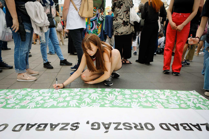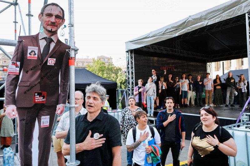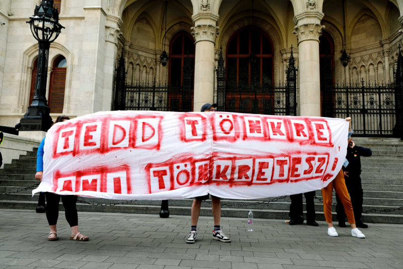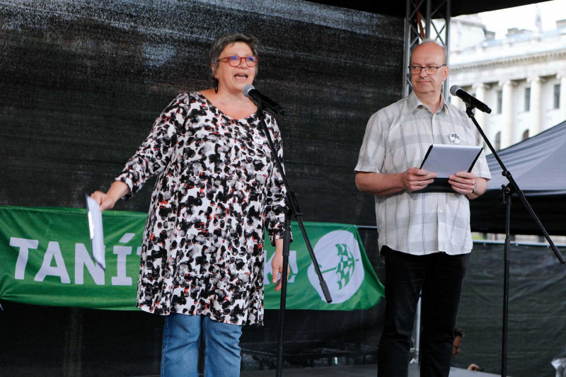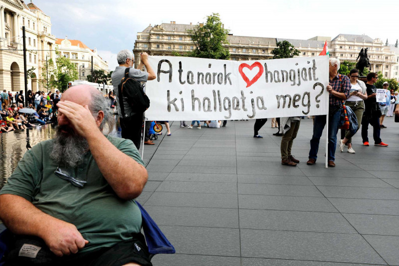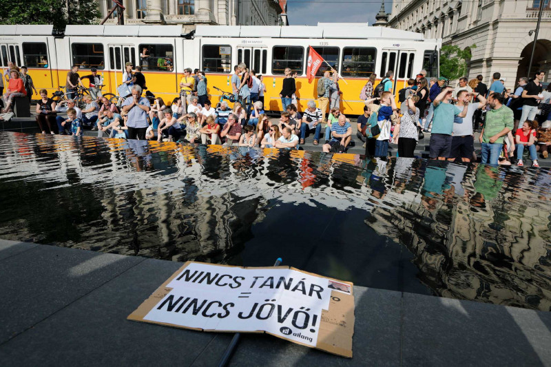 Elsőként Törley Katalin és Pilz Olivér szólalt fel a tüntetésen. Utóbbi, a miskolci Herman Ottó Gimnázium tanára azt mondta: azért zárják magukra a képviselők a parlamentet és tiltottak ki mindenkit a pénteki ülésről, mert „be vannak szarva”. Pilz szerint a „csak a pénz és hatalom megtartására képes hatalom most verik be az oktatási rendszer koporsójában az utolsó szeget”.