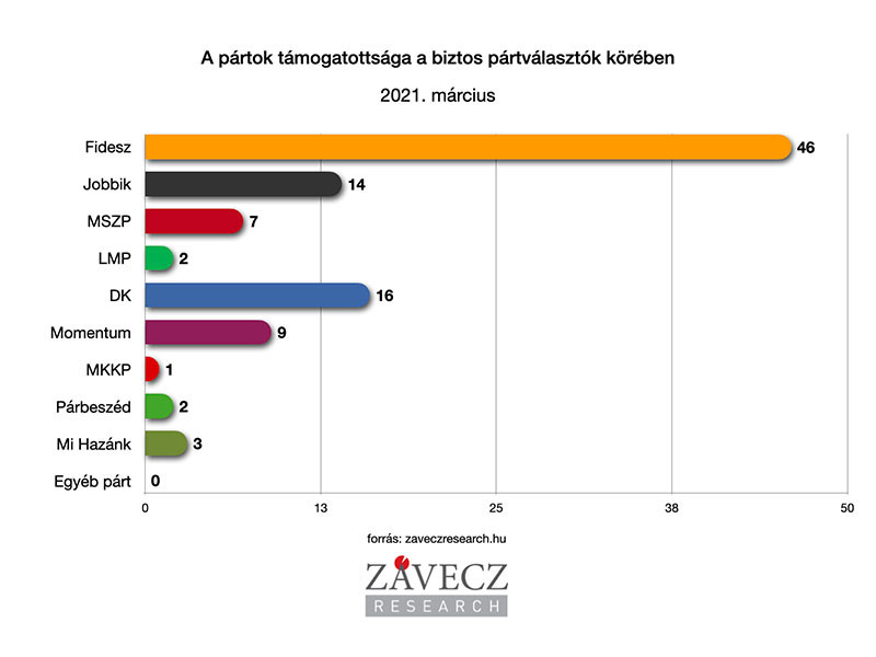 A Závecz Research adatai szerint a DK februárban a választókorúak 10 százalékára számíthatott, ezúttal 11 százalékra. A DK és a Jobbik tehát holtversenyben az ellenzéki oldal legerősebb pártjai, mögöttük a Momentum áll, az előző hónapokéval azonos, 6 százalékos táborral. Az MSZP támogatottsága nem változott, ezúttal is 5 százalékot kapott. Az LMP és a Mi Hazánk azonos, 2-2 százalékot ért el, a Párbeszéd és a Kétfarkú Kutyapárt 1-1 százalékot. A választók is nagyobb aktivitást mutattak márciusban, a februári 32 százalékról 27 százalékra csökkent azok aránya, akiknek nincsen kedvelt pártjuk.