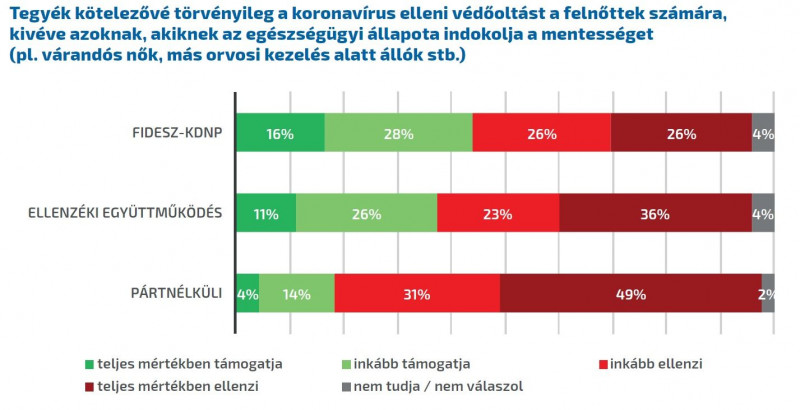 Politikai hovatartozás szerint vizsgálva a válaszok megoszlását, szembetűnő, hogy a pártnélküliek jóval nagyobb arányban foglaltak állást a kötelező oltás ellenében, mint akár a Fidesz, akár az ellenzéki együttműködés támogatói. Ha elfogadjuk, hogy a jövő évi választást az döntheti el, ki tudja jobban megszólítani a bizonytalanokat, abból az következik, hogy az oltás kötelezővé tételével aligha lesz érdemes kampányolni.