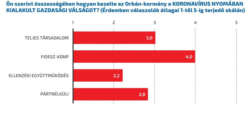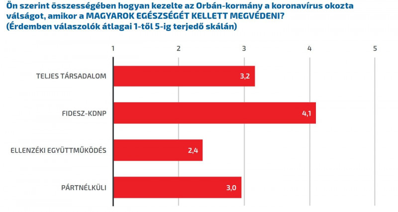 A kormány járványkezelését egészségügyi szempontból 5-ös skálán 3,2-re, gazdasági szempontból 3,0-ra értékelték a válaszadók, mindkét skálán enyhe, 0,2 százalékpontos javulás figyelhető meg a márciusi adatfelvétel óta. Ez különösen az egészségügyi kérdésnél meglepő, hiszen tavasszal rekordmértékű halálozást mértek Magyarországon a koronavírus miatt.