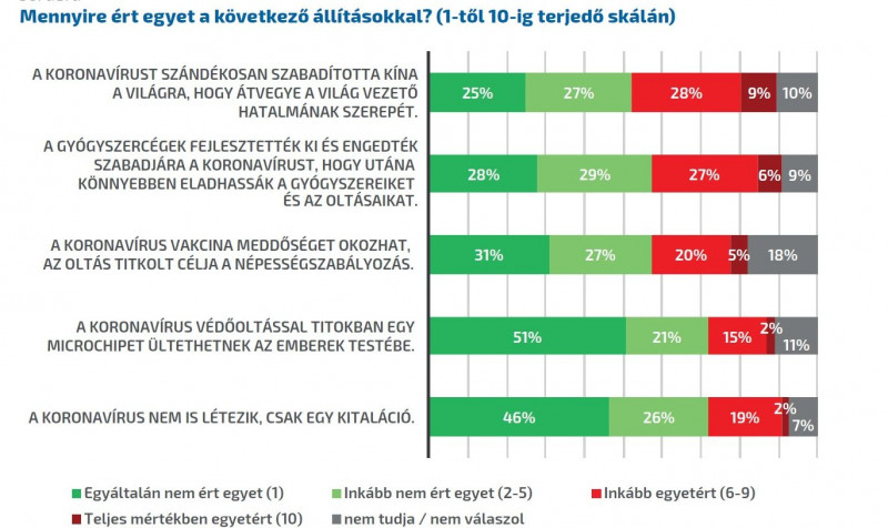 A válaszadók negyede látta úgy, hogy a koronavírus elleni vakcina meddőséget okozhat, de nem elhanyagolható a vírustagadók tábora sem, vagy azoké, akik szerint a vakcinával microchipet ültetnek az emberek testébe. (Az alábbi ábrán a piros/vörös szín jelzi azok arányát, akik inkább/teljesen elfogadják az állításokat.)