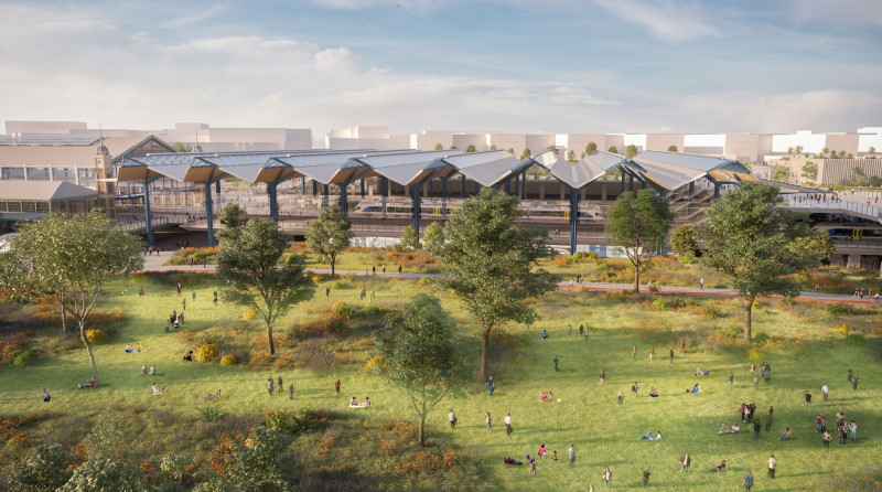 A parkot új épületek szegélyezik majd, ezek Terézváros felé zajvédő falként is funkcionálnak. A vasúti Motorszín ipari műemlék épülete pedig kulturális funkciót kap.