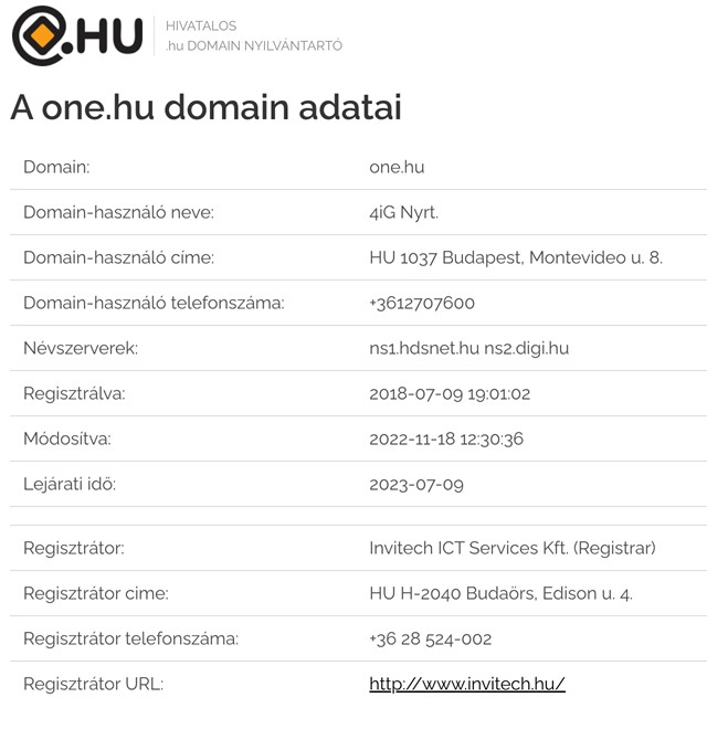 A lap értesülését alátámasztja a hazai domainregisztrációs adatbázis, amely szerint a one.hu domainnek már a 4iG a birtokosa. A domainregisztrációt legutóbb tavaly november 18-án módosították.