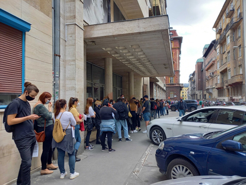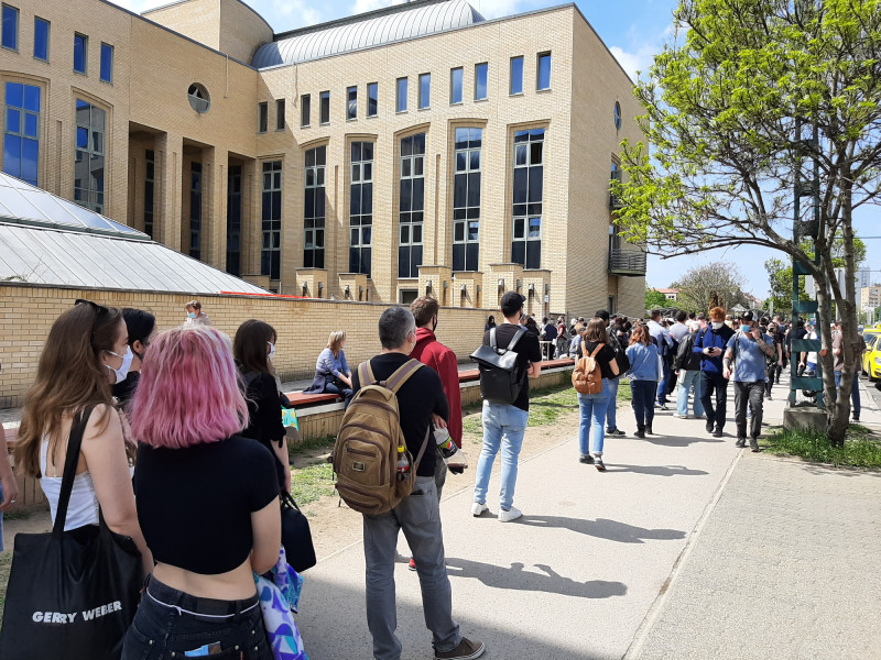 Jóval kevesebb, de szintén az épület előtt összetömörült fiatalt lehetett látni pár utcával arrébb, az Országos Klinikai Idegtudományi Intézetnél is.