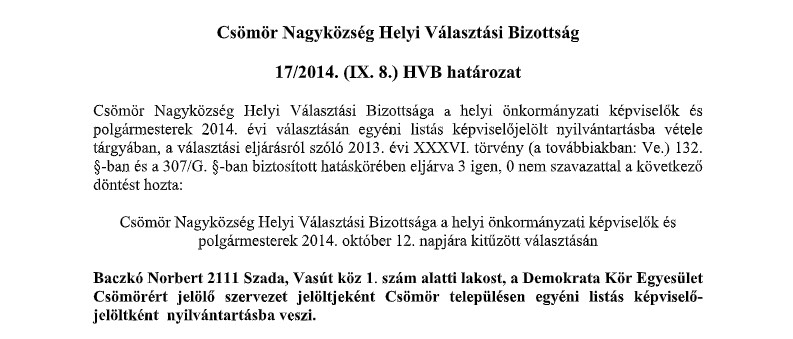 Ugyanakkor a 2014-es önkormányzati választáson egyedüli jelöltként nem csömöri, hanem szadai lakcímre volt bejelentve, amit értesüléseink szerint sokan furcsáltak.
