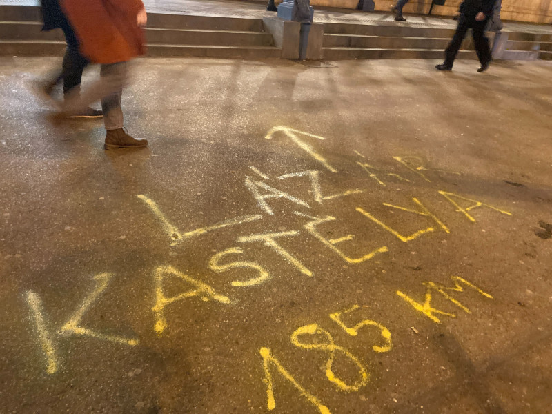 Mint arról szerdán beszámolt lapunk, valaki a Nyugati pályaudvar bejáratához is felfestette a "Lázár kastélya 185 km" feliratot, nyíllal jelölve az irányt is.