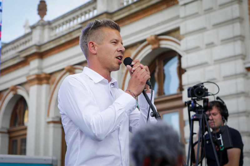 Magyar Péter felszólította Papp Dánielt, hogy jöjjön ki a teraszra és nézzen az emberek szemébe. A tömeg el is kezdte skandálni, hogy „gyertek ki, gyertek ki”. Magyar Péter szerint a közmédia olyan propagandát tol, aminek láttán Goebbels is megnyalná mind a tíz ujját. Nem érti, hogyan lehet, hogy a Tisza Pártot nem hívták be egy percre sem a közmédiába. A kormánynak azt üzente: „Magyarországon mindenki békepárti, bármennyit is hazudtok.” Azt ígérte, hogy meg fogják látogatni Rogánt Antalt, „és természetesen el fogunk látogatni a Kunigunda utcába is”. Egy alkalommal Tónika-shownak nevezte a közmédiás vitát. „Legyetek nagyon békések, a DK szimpatizánsokkal is legyetek békések, a legújabb felmérések szerint egyre kevesebben vannak, vigyázni kell rájuk” – kérte a megjelent híveitől.