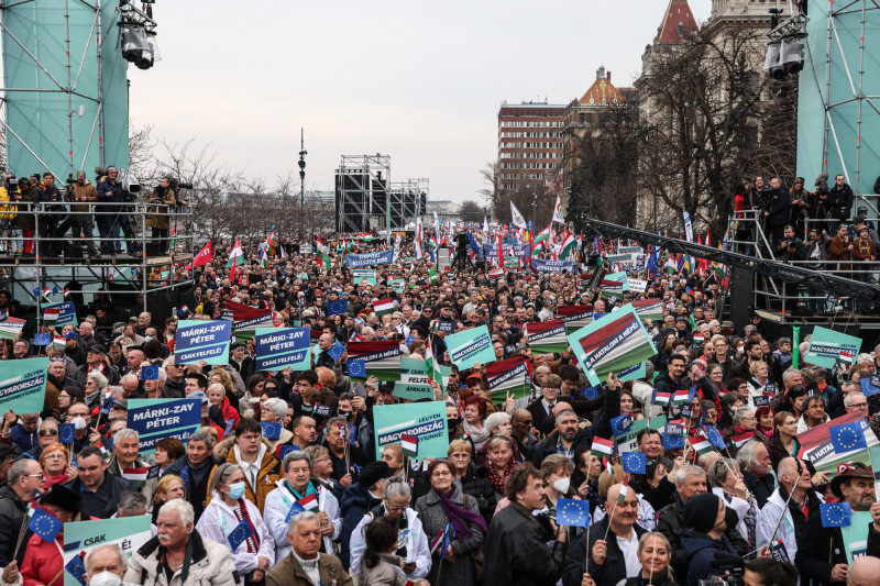Márki -Zay továbbra is a miniszterelnökre célozva folytatta: "Aki felelős azért, hogy ma sokan szégyenkeznek, mert magyarok. Rombolja a tekintélyünket. Elvette önérzetünket és nemzeti büszkeségünket. Éket vert barátok, kollégák, szomszédok közé, családok és családtagok közé." Az ellenzéki politikus felhívta a figyelmet arra, "húsz nap múlva arról kell szavaznunk, hogy ismét egy nép, egy nemzet legyünk, és ne kívülállók a saját hazánkban. Mi is egy nemzet vagyunk, az a nemzet, amelyért 1848 hősei a vérüket ontották."