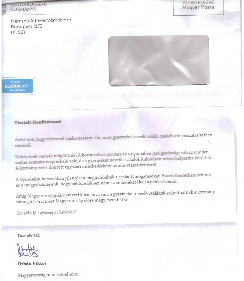 Orbán levelében egyébként a kiutalásról, vagy bármi érdemleges tájékoztatásról nincs szó, csak arról, hogy az illető címzett részesül az adóvisszatérítésben. Ezután kizárólag a kormányt fényező kampányszöveg következik.