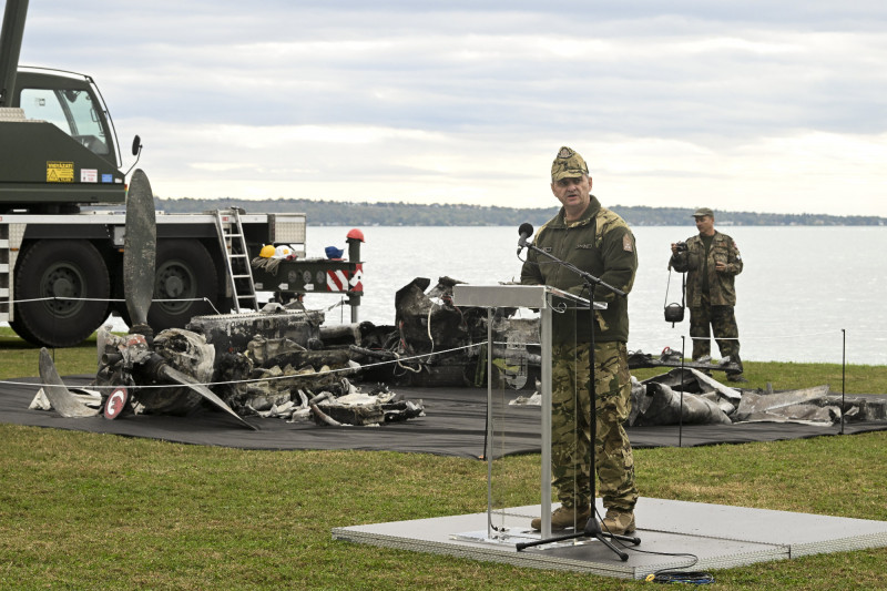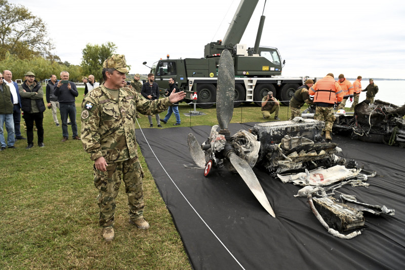 Magó Károly zászlós, az MH Kiss József 86. Helikopterdandár kutatója elmondta: 1941 júniusában Magyarország megkapta a jogot a legmodernebb haditechnika gyártására, így vált lehetővé a Balatonból kiemelt gép elkészítése is. Beregszászi Sándor szakaszvezető 1944. július 2-án halt hősi halált az amerikaiakkal vívott harcban - tette hozzá. Az első merüléseket a géproncshoz 2020-ban végezték, az első felszínre került roncselemeket 2021-ben mutatták be. A feltárás idén folytatódott mintegy öt méter mélyen, a gép több eleme elkorrodált, az iszappal fedett elemei maradtak jobb állapotban - tette hozzá.