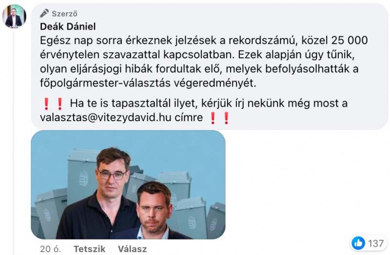 A második helyezett hangsúlyozta, hogy az érvénytelen szavazatok száma 76-szorosa a kettejük közötti különbségnek. „Mindannyiunknak érdeke, hogy a következő polgármester megfelelő legitimitással nyerjen” – mondta, hozzátéve, hogy csakis jogi eszközökkel kíván fellépni, és amennyiben hitelesen kiderül, hogy Karácsony csak egyetlenegy szavazattal, de megnyerte a választást, „elsőként gratulál” neki.