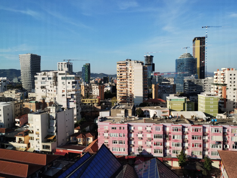 Tirana látképe. A szocializmus idején épült blokkházak és gombamód szaporodó üvegpaloták határozzák meg a városképet. Nagyvárosi nyüzsgés, elképesztő forgalom, egyszerre nyugati és balkáni állapotok jellemzik a bő félmilliós várost.