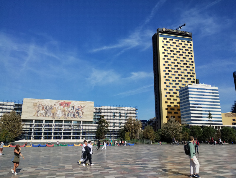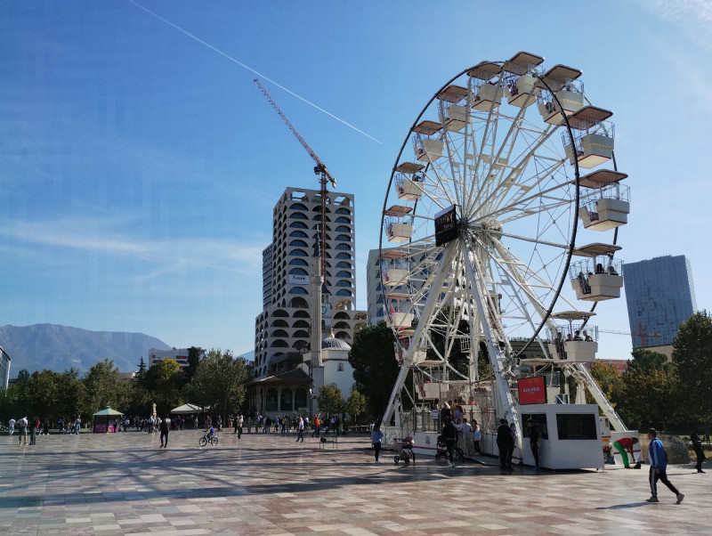 Tirana főtere, a Szkander bég tér (Szkander bég, más néven Kasztrióta György az albánok nemzeti hőse, történelmük legfontosabb alakja, a 15. században mintegy huszonöt esztendőn keresztül eredményesen küzdött a törökök ellen) jó példa arra, hogyan lehet tönkretenni egy karakteres, jellegzetes nagyvárosi főteret az igénytelen térkövezéssel és a mindenféle koncepciót nélkülöző várostervezéssel. Korábbi, 2005-2006-os albániai utazásunk alkalmával azt tapasztaltuk, hogy a teret még meghatározó épületei (nemzeti múzeum, opera, mecset, nemzeti bank stb.) uralták, hangulatához hozzátartozott a kaotikus autós és gyalogos forgalom. Mára az egész főteret letérkövezték, körülötte magasházakat, üvegpalotákat húztak fel. Ennek az eredményét mutatja a fotó: a kép közepén látható mecset és a mögötte alig kivehető óratorony már jóformán semmilyen jelentőséggel nem bír a tér látványa szempontjából, annyira elnyomja őket a mögéjük épített két modern magasház.