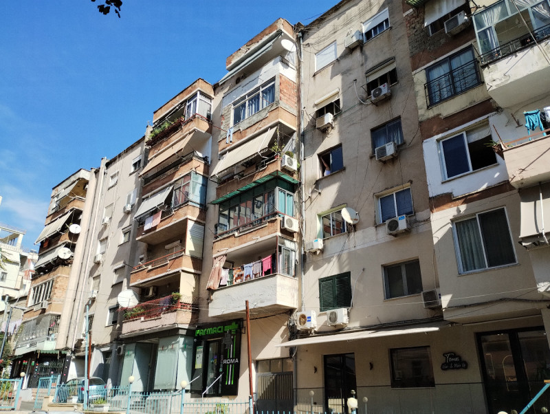 Lakóépületek egy tiranai utcában. Semmiben sem különböznek egyes kelet-európai országok városainak blokkjellegű lakóházaitól.