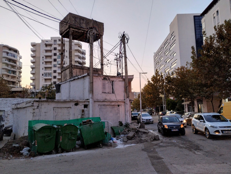 Utcakép Vlorában, nem messze a belvárostól. Konténerek, szemét, törmelék, sitt, járhatatlan járda, összevissza futó vezetékek, arrébb viszont modern, új épületek. Ez a fotó igazából bármelyik albán városban készülhetett volna, annyira jellemző az országra, és annyira meghatározza a városképet mindenhol.