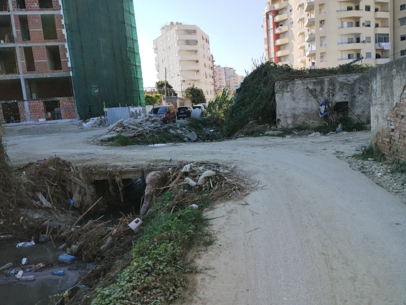 Az előzőhöz hasonló állapotok egy vlorai építkezés közelében. Bármennyire nehezen hihető, de ez is egy utca, a kép bal alsó sarkában látható szemetes, csatornaszagú vízfolyással, betontörmelékkel, betonfallal. A háttérben, a tengerpart felé modern lakóépületek, amelyek között ugyanúgy előfordulnak burkolatlan, szemetes, poros utcák, lepusztult földszintes, egyemeletes házak.