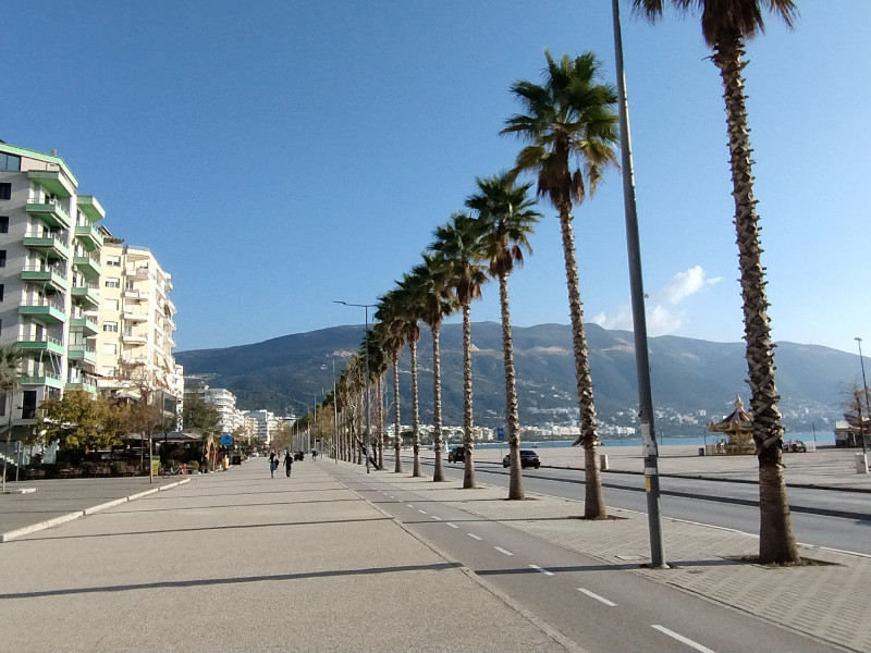 Tengerparti sétány Vlorában, Dél-Albánia legnagyobb városában. Vlora jelentős szerepet töltött be az albán történelemben. 1912-ben itt kiáltották ki az ország függetlenségét, 1920-ban kiűzték a várost birtokló olaszokat, majd amikor 1939-ben Vlora ismét olasz megszállás alá került, a lakosság folyamatos ellenállást tanúsított velük szemben (Vlorát ezért Hős Városnak is nevezik). Az 1997-ben kitört piramisjáték-botrány okozta zavargások egyik központja is Vlora volt.