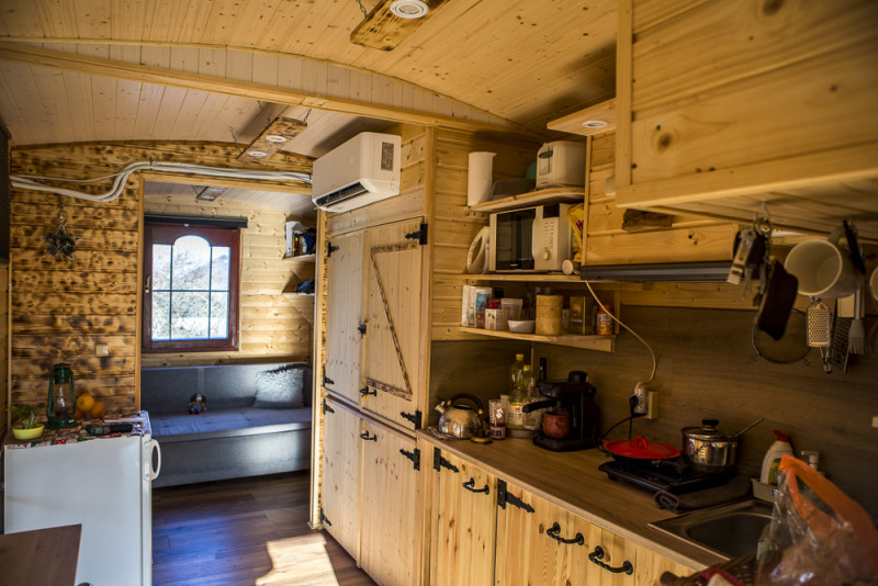 Nyolc méterszer két méter negyven – ekkora egy klasszikus kisház, vagyis tiny, amelyet utánfutóra lehet tenni és bárhová le lehet rakni. Van benne egy picike nappali, konyha, zuhanyzó, vécé, egy kis galéria kétszemélyes ágymatraccal. Ildikónak és Attilának nem tetszett ez a modell, szerintük túl dobozszerű, ők inkább a régi villamos- vagy vonatbelsőre emlékeztető ívelt tetőre esküsznek. Igaz, így elvész a galéria, de valamit valamiért. A nyolcszor kettőnegyvenes tiny vázra így Attila olyan kisházat épített, amilyet otthonosabbnak gondoltak.