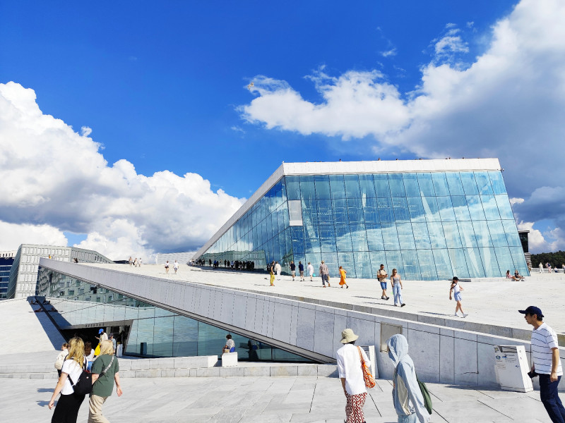 Oslo modern operaháza megmászható, s egy nem egészen rövid séta után a tetején találjuk magunkat, ahonnan pazar kilátás nyílik a modern városra. Úgy építették meg az épületet, hogy némi kaptató után a hatalmas koncertterembe is belátva jutunk fel kívülről a tetőre.