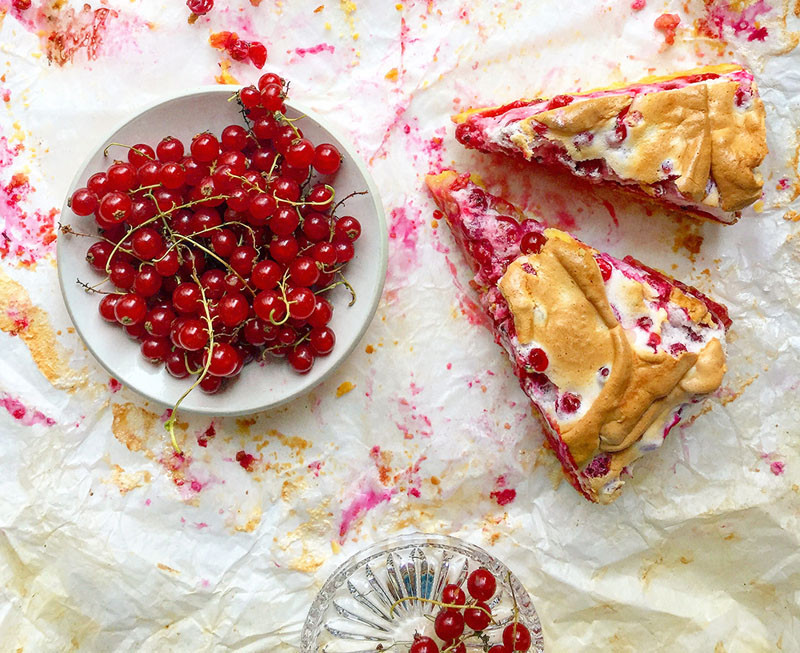 A málna, úgy tűnik, mára luxuscikk lett. A piaci ára és a hozzáférhetőség alapján mindenesetre egyértelmű, hogy az idén nemhogy málnadzsemet nem fogunk befőzni, de még egy-egy komolyabb málnás desszertet is kétszer meggondolunk, maximum pár szemet vesz az ember a tetejére (a többit meg fagyasztott málnából vagy korábbi málnalekvárból pótolja ki). Tele van viszont a piac szebbnél szebb ribizlivel, legyen hát ő a sztár ezen a nyáron. Jöhetnek a hideg ribizlilevesek és mártások, csatnik, zselék, habok, desszertek. Az alább ajánlott süteménynek két kulcsa van: az egyik az omlós tészta sóssága. Muszáj jól eltalálni és megfelelően sózni, különben „lapos” lesz ízben. Szintén lényeges, hogy jó sok ribizli kell bele, mert annak a savanyúságától működik az egész. A tojásfehérjehab alapvetően édes, így kell bele a savanyú kontraszt. Ízes, ropogós, omlós tészta, rajta édes-savanyú hab – így kerek a világ. Kizárólag ribizlivel (esetleg fekete ribizlivel) ajánlom, minden más gyümölcs túl édes hozzá. Az alábbi adag igen kiadós, sok szelet jön ki belőle és az átlagosnál nagyobb tortaformában sült, ha valaki nem akar ilyen sokat készíteni, akkor lehet felezni vagy kétharmadolni a mennyiségeket. Leginkább frissen, a sütés napján finom, utána elkezd összeesni, és a ribizli leve is elkezdi áztatni. Sütés után két-három órával, még kissé langyosan, de már szeletelhető állapotban van a csúcson.