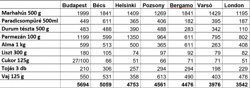 Viszonylag egyszerű és viszonylag egységes volt a kínálat darált húsból és durumtésztából. Bár marhát kellett volna keresni, Varsóban és Helsinkiben sajnos marha-disznó mix került a virtuális kosárba. Londonban a mix és a marha között nem volt nagy különbség, mindkettő 4 és 5 font között árazódott, a többi kettőnél sajnos nem tudni, mennyivel drágább a marha, de a végeredményt szinte biztosan nem befolyásolja. A marha amúgy Budapesten a legdrágább, Londonban a legolcsóbb.