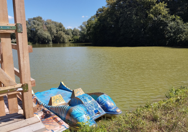 A tábor területén lévő Kék-tó két részből áll: az egyik horgásztó, a másik fürdőtó, a kettő között egy hetvenes években épített zsiliprendszerrel. Annak idején esőzéskor a szántóföldekről a műtrágya lefolyt a Manas Garden területén lévő Kék-tóba, de immár három éve nem kerül a vízbe semmiféle vegyszeres lé. „Megkaptuk a fürdési engedélyt, nagyon jó a víz minősége” – újságolja Fáy Zsolt.