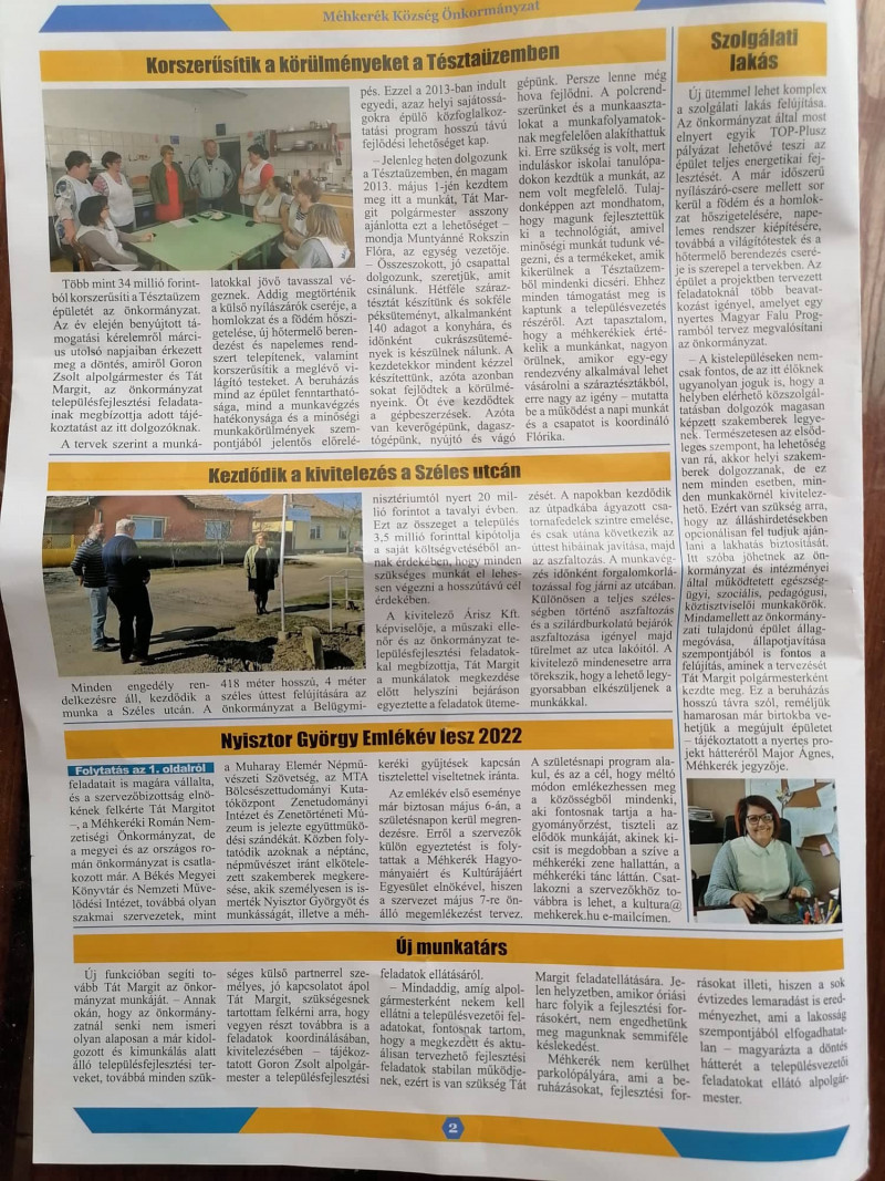 Ezzel viszont a méhkeréki önkormányzati hivatalt vezető jegyző törvénysértést követ el. Az információs törvény ugyanis legfeljebb 15 napot ad neki a válaszadásra, amit a veszélyhelyzetre hivatkozva újabb 45 nappal hosszabbíthat meg. De ezt a rendelkezésére álló 15 napon belül nem tette meg. Major az elmúlt csütörtökön, második telefonos megkeresésünkre sem volt hajlandó Tát Margit foglalkoztatásával, díjazásával és feladatkörével kapcsolatban semmit sem mondani. Ám közben a békési kisközség minden lakosához eljuttatott helyi lapban külön cikkben számoltak be arról, hogy a költségvetési csalás miatt megbukott, elítélt és bűnösnek mondott volt polgármester „az új munkatársa” a méhkeréki önkormányzatnak. Méghozzá településfejlesztési koordinátorként. Minderről több helybeli tájékoztatta a Narancs.hu-t, elküldve a szóban forgó lapszámot.