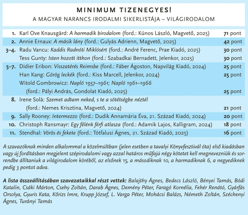 Nem lepődtünk meg, hogy az idei Tizenegyes-listát is a norvég sztárszerző, Karl Ove Knausgård vezeti, de talán az is borítékolható volt, hogy az elmúlt két év Nobel-díjasai, Annie Ernaux és Han Kang elnyerik a szakmai zsűri tetszését. Viszont meglepetésnek mondható, hogy két ragyogó mű, Gombrowicz naplói és Stendhal klasszikus regénye a múltból tornázta fel magát a kortárs listára – a magyarázat mégis egyszerű: ezeket most fordították le vagy újra. És fáj a szívünk azokért a műremekekért, amelyek kaptak ugyan szavazatot, de nem eleget ahhoz, hogy bekerüljenek a kezdő tizenegybe. (Zavar a futballszimbolikában: jó lenne eldönteni, hogy a büntetőre vagy a csapatlétszámra utalunk.) Így egyszerre bízunk abban, hogy listánk az idén is támpontot ad az olvasóknak, ám további felfedezésekre is ösztökél.