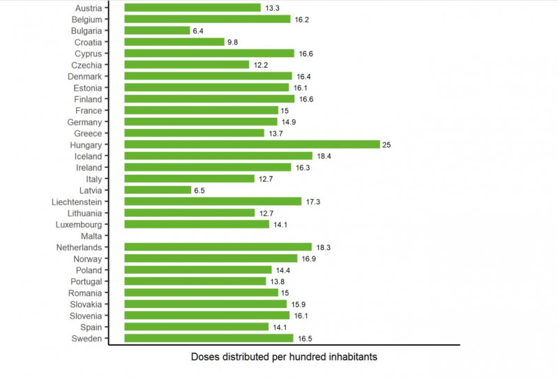 Az Európai Járványvédelmi és Betegségmegelőzési Központ legfrissebb (március 11-i) jelentése szerint valóban jelentős különbségek vannak az uniós tagállamokba érkez vakcinák mennyiségében. Míg Magyarországon 100 felnőtt lakosra 25 adag vakcina érkezett, Bulgáriában csak 6,4 adag.