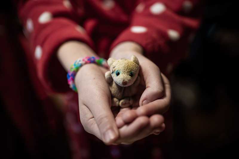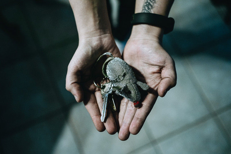 Aleksza és öt éves kislánya március 3-ig bírták elviselni a folyamatos robbanásokat városukban, Bolsaja Dimerkában. Amikor a szomszéd házat teljesen megsemmisítette egy becsapódott fehérorosz rakéta, nekiindultak a kicsit sem veszélytelen útnak. „A humanitárius folyosón ránk, civilekre is lőttek az oroszok. Ez háborús bűn, és nem értem, hogy hiheti bárki, hogy az ezt rögzített fotók és videók álhírek.” A házuk kulcscsomóján az egér egy talizmán, ami már gyerekkora óta megvan, és mindenhova viszi magával. „Február 24-ig normális életem volt, imádtam a barista munkám, szerettem az otthonom. Azóta ezeket elvesztettem és már csak a remény maradt számomra a folytonos félelem mellett.”