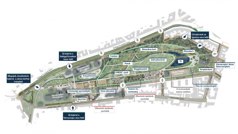 Az államtitkár Facebook-posztja szerint 15 ezer négyzetméterrel bővül majd a zöldterület, ahol egyszerre lesz lehetőség az aktív kikapcsolódásra és csendesebb, természetes környezetbe való elvonulásra, miközben a közel 240 éves Városmajor végre 21. századi, modern és kényelmes parkká válik. A tervezett fejlesztés minden részletére kitérő bejegyzésből kiderül, hogy a pihenő- és sétakerti funkciók mellett lesznek majd az új parkban