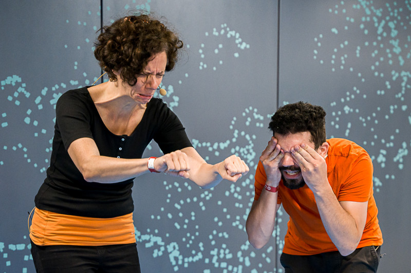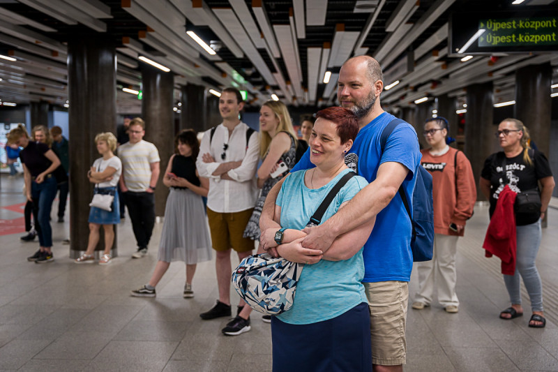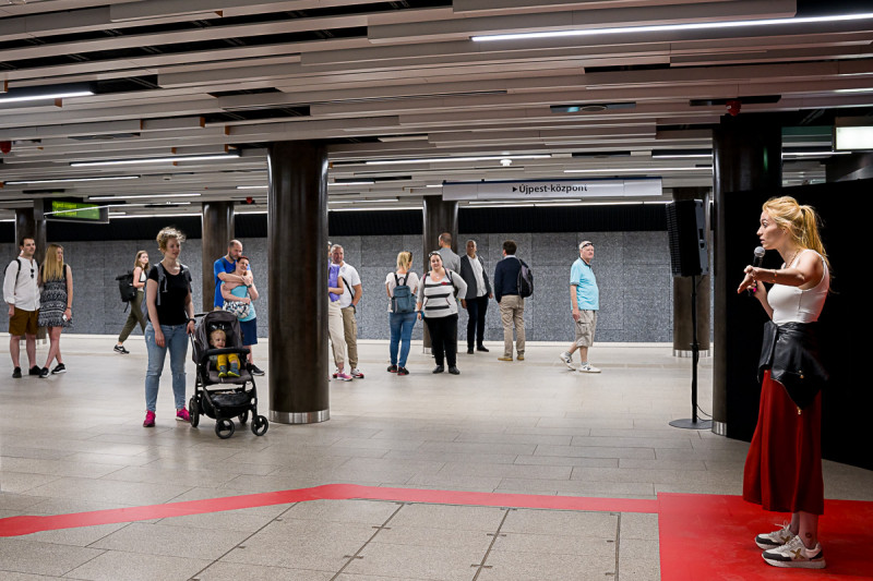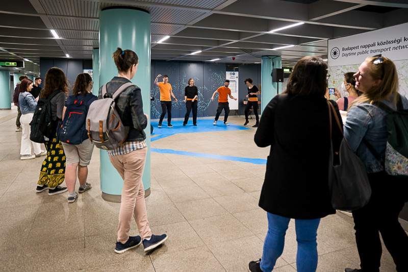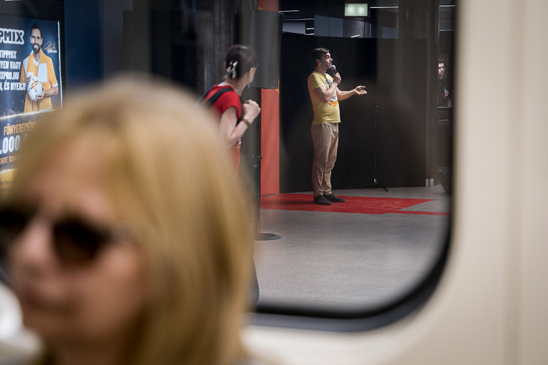 A Momentán Társulat kora reggel játszott az Arany János utcai megállóban. A Legyen szép napod mottóra improvizáltak a közönség bevonásával