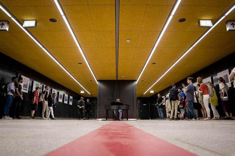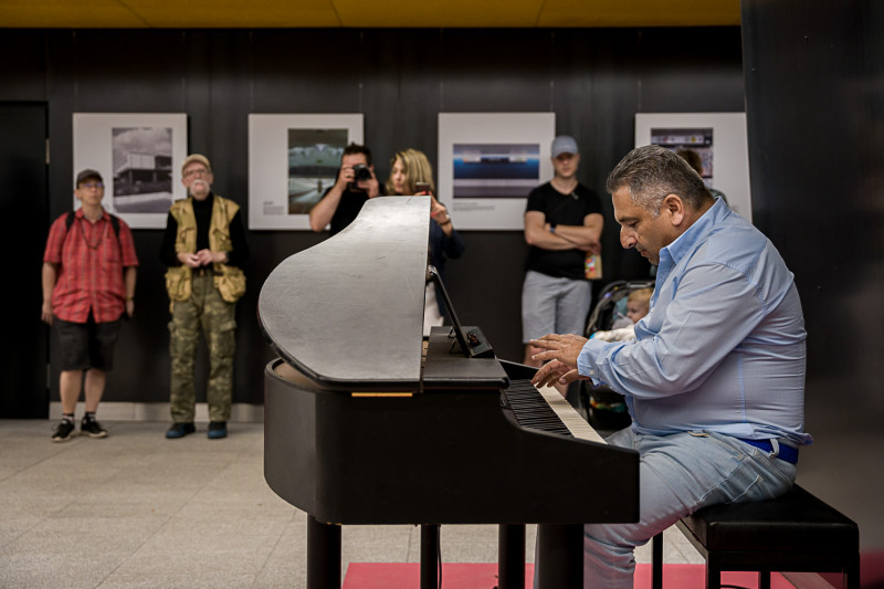 A Lehel téren délután bárzongoristák játszottak (a képen Villás György), ahol a közönség közben elmerülhetett a Metrótörténeti fotókiállításban