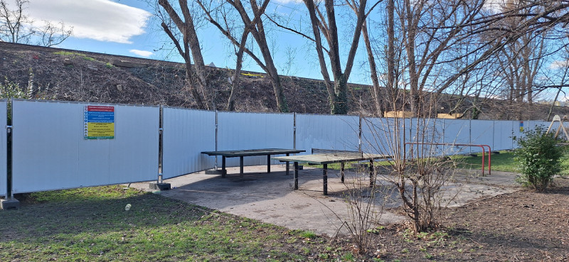 Most már lehet tudni. Az elmúlt két hétben ugyanis suttyomban elkezdték kijjebb pakolni a kordont. Először csak azt lehetett látni, hogy a körbedeszkázott fák egyszer csak a kordon mögé kerültek, de második körben már annak látszatára sem ügyeltek a beruházók, hogy bármire is tekintettel lennének. A kordon ma már keresztülmegy a kutyafuttatón, kettévágja a kis sportpályákat. Az egyiknél épp a kapu sarkánál halad el, vagyis itt focizni, játszani biztosan nem lehet már, a másiknál a kaput is kifűrészelték a helyéből. Nem jártak jobban azok sem, akik esetleg pingpongoztak volna, a kordon ugyanis pár centivel megy el az asztal mellett. De belehasít a játszótérbe is – még jó, hogy a hintánál hagytak egy kis holtteret. A bringások már nem jártak ennyire jól, a kerékpárutat keresztbe vágja a kordon.
