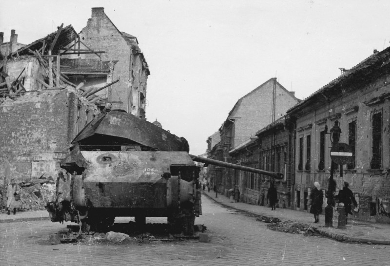 A Retek utca a Fény utcától a Széna tér felé nézve, 1945-ben. Német Panther típusú harckocsi roncsa