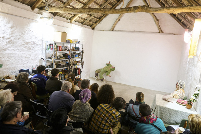 Alkonyatkor Zsombón a záportározónál, illetve a záportározóban a közeli tanyán felnőtt, fővárosi táncművész Bitó Katalin és Korom Sasu táncolták el az emberi beavatkozások következményeire reflektáló föld-víz-levegő koreográfiájukat. A Kisapáti-tanyán várt az utolsó előadás és a vacsora. Az idillinek tűnő, ám a helyi adatszolgáltatók elmesélése alapján számos ökológiai kihívástól sújtott terepre leszállt a töksötét. A kivilágított fészerben, szerszámok között a magányról merenghettünk Szász Zsófia koreográfussal, aki legutóbbi, Lágymagány című népszerű szólóját itt rendhagyó módon a helyi lakos Kisapáti Katalinnal duóban adta elő.