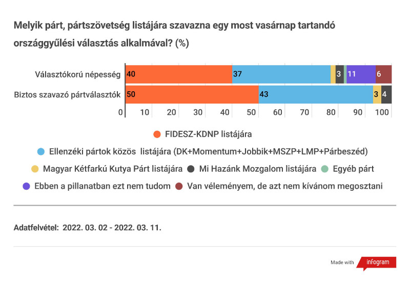 A felmérés szerint a teljes, választókorú népesség körében az ellenzék túljutott a támogatottsági mélypontján, újra növelni tudta támogatottságát, míg a Fidesz−KDNP hónapok óta tartó lassú, de folyamatos növekedése tovább folytatódott. Március elején a két lista közötti távolság 3 százalékpont.