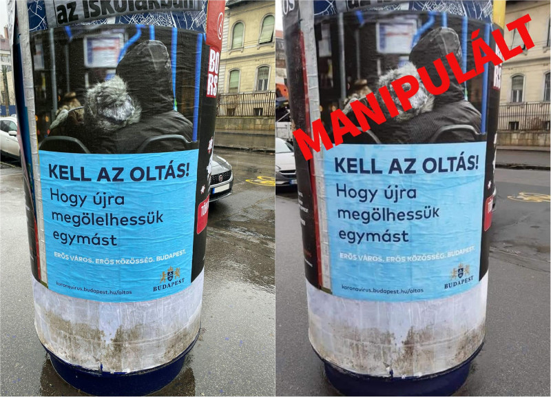 A kép a Kell az oltás! szlogen olvasható és míg az eredeti képen a szöveg alatt az áll: "Hogy újta megölelhessük egymást", addig a manipulált képen a "Hogy újra megölhessük egymást" szöveg olvasható.
